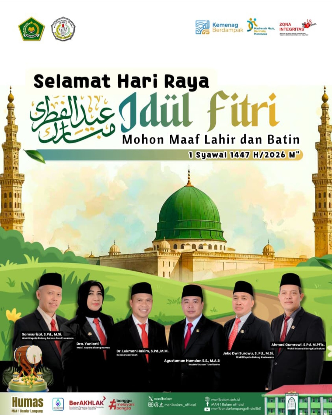 Sebagai bagian dari keluarga besar MAN 1 Kota Bandar Lampung, saya mengajak seluruh elemen madrasah untuk terus menjaga semangat kebersamaan, meningkatkan kualitas diri, dan berkontribusi dalam membangun lingkungan pendidikan yang lebih baik. Mari kita jadikan Idul Fitri ini sebagai awal yang baru untuk lebih besar dalam belajar, bekerja, dan mengabdi demi kemajuan madrasah yang kita cintai.