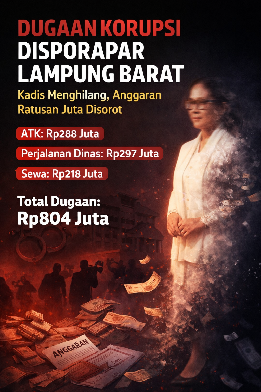 LAMPUNG BARAT —– Setelah kasus dugaan Korupsi belanja alat tulis kantor, perjalanan dinas dan belanja sewa, yang berpotensi merugikan keuangan daerah hingga Rp804.506.000 tahun 2025 mengemuka kemana-mana, Kepala Dinas Kepemudaan, Olahraga dan Pariwisata (Disporapar) Lampung Barat menghilang entah kemana rimbanya, ada kabar yang menyebut jika sang kepala dinas memilih menghilang dari peredaran alias ‘Buron’ demi menghindari cecaran awak media. Kasus ini perlu mendapat atensi khusus dari Bupati Lampung Barat demi masa depan daerah yang dipertaruhkan.
