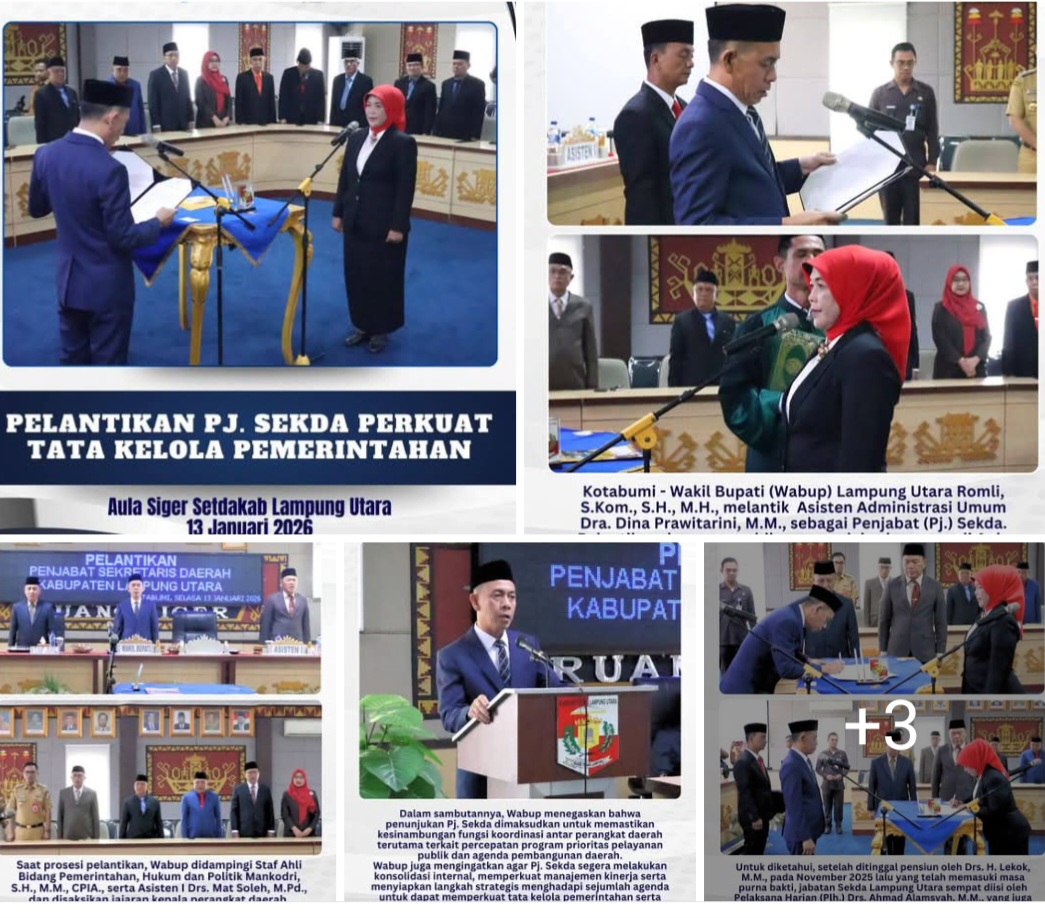 Kotabumi – Wakil Bupati (Wabup) Lampung Utara Romli, S.Kom., S.H., M.H., melantik Asisten Administrasi Umum Dra. Dina Prawitarini, M.M., sebagai Penjabat (Pj.) Sekda. Pelantikan dan pengambilan sumpah berlangsung di Aula Siger, Selasa 13 Januari 2026.